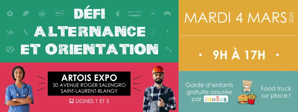 Si vous êtes en pleine réflexion sur votre orientation professionnelle ou si vous recherchez une alternance, ne manquez pas ce défi Alternance et Orientation. C’est une occasion unique de découvrir et de tester différents métiers directement sur le terrain. Le défi se déroulera le mardi 04 mars 2025, de 09h à 17h00, à Artois Expo, 50 avenue Roger Salengro à Saint Laurent Blangy.