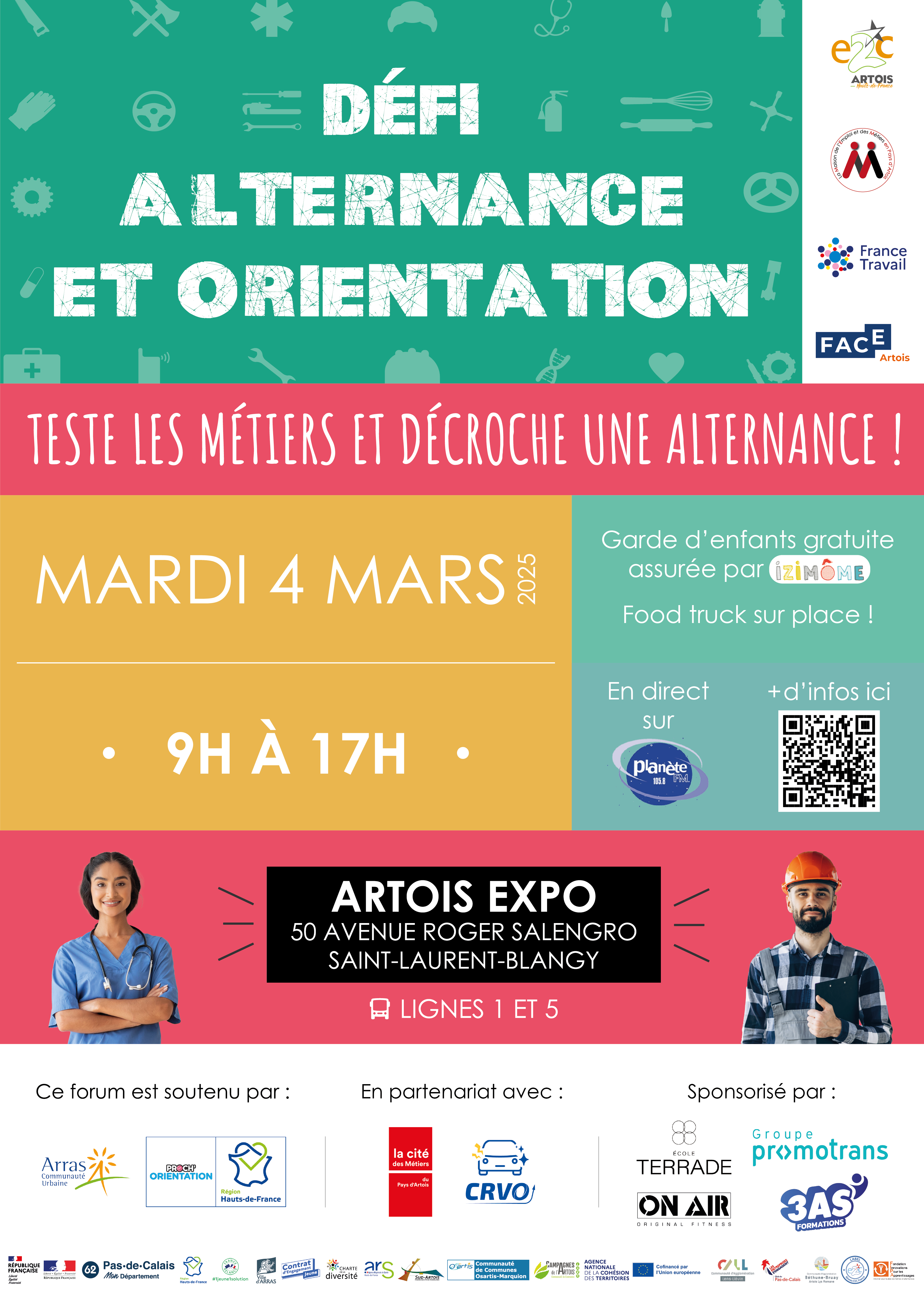 Merci aux partenaires qui soutiennent cet évènement : La Région Hauts de France, la CUA d’Arras, Proch’Orientation, La cité des métiers du Pays d’Artois, CRVO et sponsorisé par l’Ecole TERRADE, 3AS formation, ON AIR Fitness et le Groupe Promotrans.